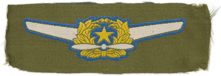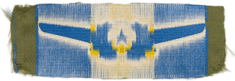Flight service wings, introduced in October 1943 for all flying personnel serving with the IJA Air Service, machine woven to an approximately 10.5cm x 4cm section of olive drab rayon. The insignia is comprised of stylized, silver-white wings, 8.3cm from tip to tip, to either side of a golden-yellow wreath of laurels, which encloses a golden-yellow, five pointed star, beneath which is a silver-white, horizontal propeller, all outlined and against a medium blue base. The edges are roughly cut and lightly frayed, but the unissued insignia itself is still very clean and bright. Still on original factory roll material.