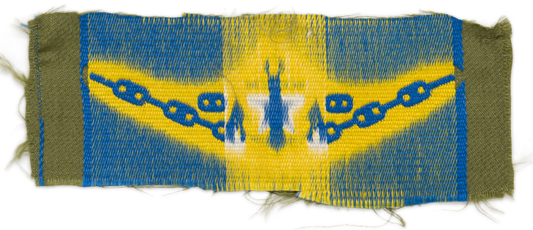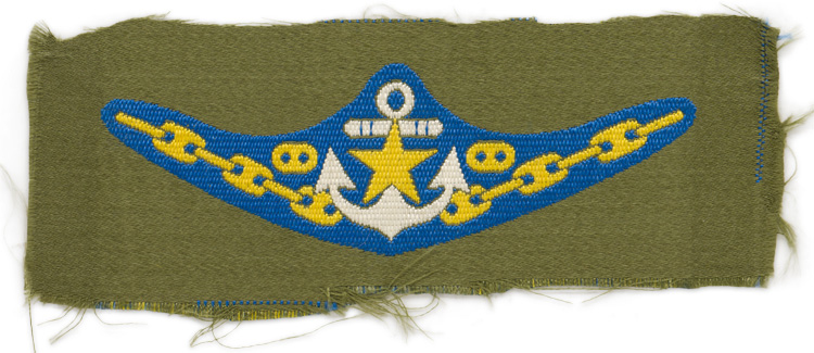 A nice quality, machine embroidered badge for army sea born troops showing the form of an anchor, flanked by anchor chains, with a single star affixed embroidered to the center, all outlined and against a medium blue base. The edges are roughly cut and lightly frayed, but the unissued insignia itself is still very clean and bright. Still on original factory roll material.
