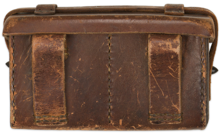 Standard issue, model 30 (1897) ammunition pouches as used by the Japanese navy throughout the war. The 15cm x 10cm, dual pocket, rubberized canvas pouch originally would have held two groups of three five-round clips of 7.7mm ammunition. Hinged top flaps open outward and are each secured by a horizontal closure strap, with stud holes to each end, passing through vertical loops to the flap tops, and attaching to steel studs on either side of the pouches. Two vertical belt loops are sewn to the reverse. The interior is separated into two compartments by a thick divider. The pronounced separation line to their exteriors formed by this division distinguishes them as navy rather than army issue.