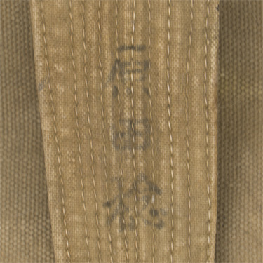 Introduced in 1938, the approximately 33cm x 29cm x 6.5cm, khaki-colored canvas knapsack features a top fold-over flap and a harness arrangement to the reverse comprised of two shoulder straps proceeding from each side of the upper back, and two narrower straps proceeding from each side of the lower back. To the ends of each of the shoulder straps, both of which have reinforced stitching, are sewn tabs with two brown-painted metal rings to them. The narrower straps to the base also have reinforced stitching to them, and even narrower straps sewn to their ends which pass through and adjust on the shoulder strap rings. Two long, narrow straps that would normally be alongside each of the shoulder straps are missing.. A narrow strap is sewn to the center of the upper back. Kanji markings can be seen under the flap with hand stitch kanji. Shows moderate/heavy usage and wear.