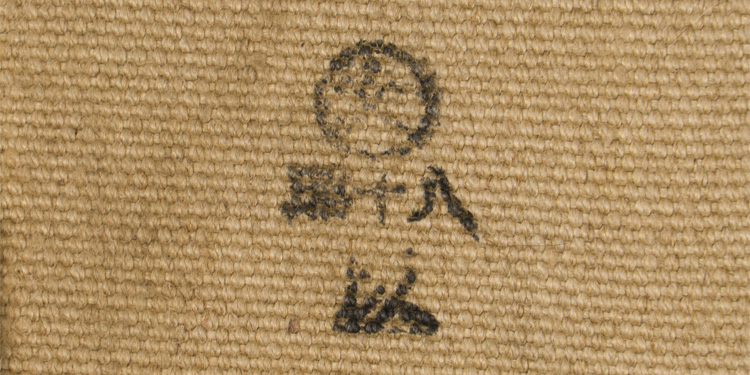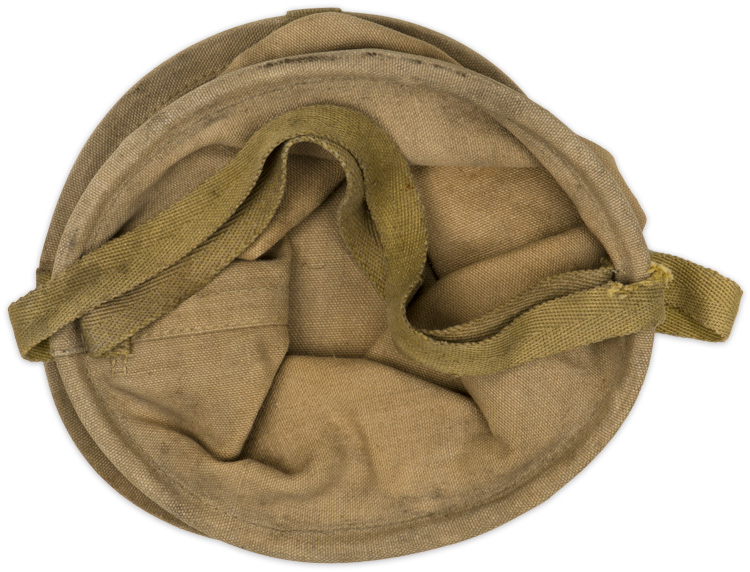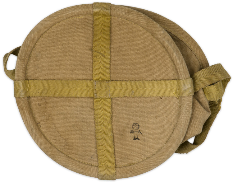 A 28cm diameter, canvas collapsible water bucket that was attached to the backpack. The bucket measures approximately 28cm high with a rigid bottom and opening. Kanji is stamped to the bottom of the bucket.