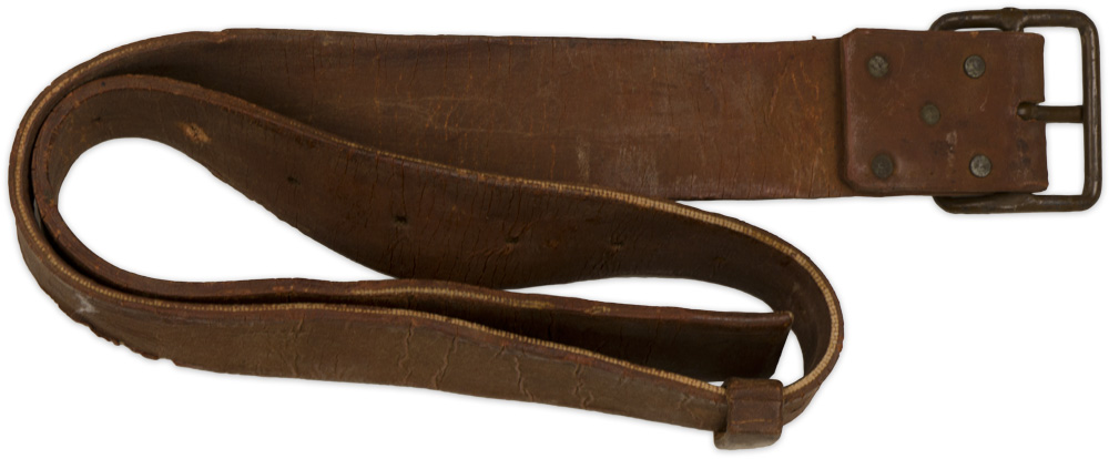 The standard, Type 30 (1897), uniform equipment belt in use by Japanese forces until the end of the war, upon which would have been slung the two forward and one reverse ammunition pouches and the bayonet frog. The rubberized canvas belt has one end folded and sewn around a single claw metal buckle, and the other end has 14 corresponding buckling holes to it. Like most of the rubberized types, this one is still very stiff. Would be able to use as a display, but not worn. Shows the expected age.