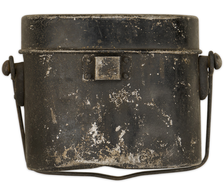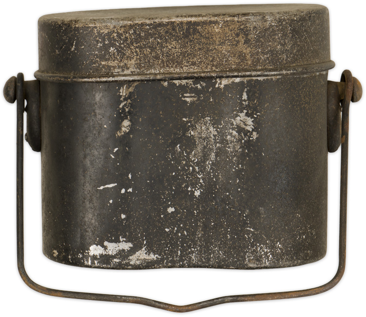 the standard aluminum construction, kidney-shaped mess kit. Its thick wire handle is attached to rivetted studs on either of the body immediately below the cover. A rivetted metal slot is to the front of the body for the retaining strap. Two indentations are to the back of the body for use as a measure. Lid is hard to remove.