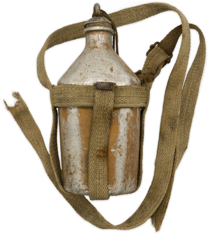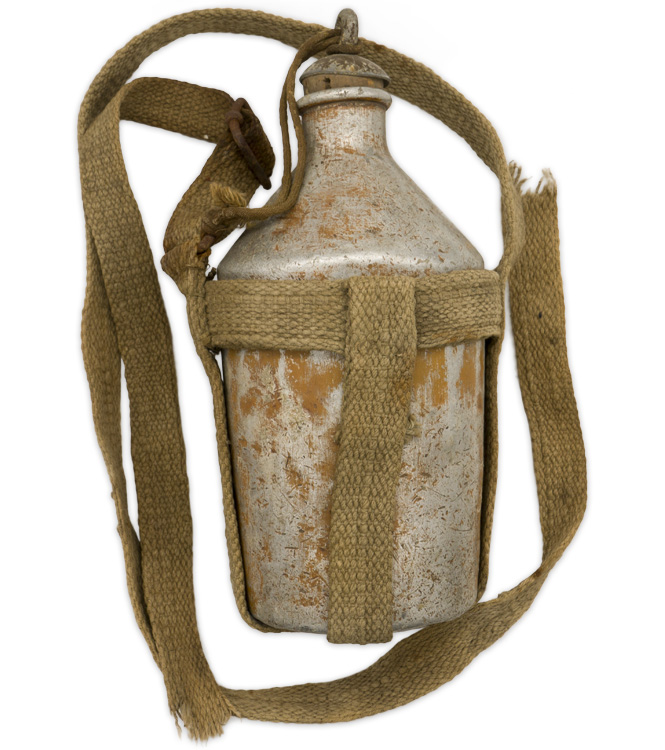 A brown painted, aluminum 540ml canteen with webbed harness, and a cork stopper with aluminum cap and eyelet. The leather strap that would have extended through the eyelet to the body via buckles is missing, which led to the owner using a cord to attach the stopper to the body. The shoulder strap is torn in half. Markings are visible to the bottom of the canteen. Of Note: This model of canteen is also known as the "Sake Bottle Canteen".