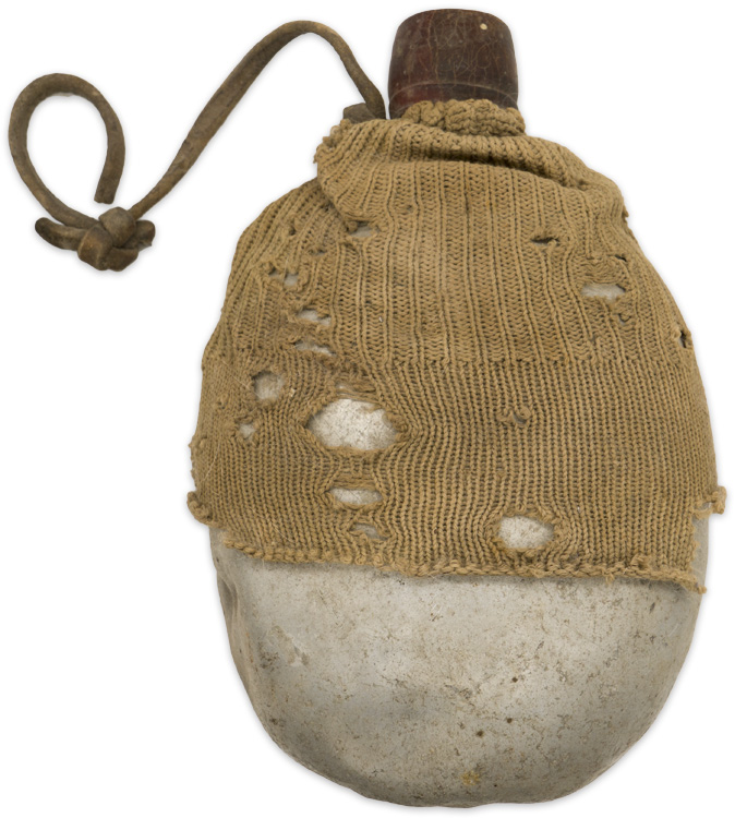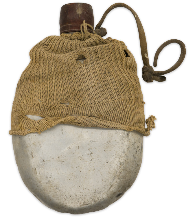 A small, aluminum canteen, in the form of a vertical oval, 5.5cm x 12cm x 20cm, including its stepped neck. The opening is covered by a brown leather cap that I am unable to remove. This cover is marked "49/192/1001". The canteen has a make shift cover using what appears to be a sleeve of a knitted sweater or possibly a sock. The body has numerous dents, especially to the bottom. The reverse of the canteen is somewhat hollowed-out. A leather cord is tied around the neck. No visible markings.