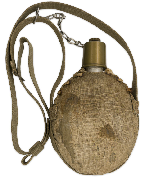 Original cover, lace-up string, chain & cap. Aluminum construction. Nice complete untouched Japanese Navy canteen.