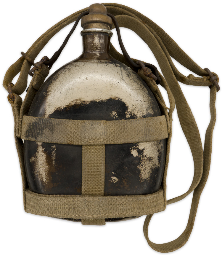 A black painted aluminum canteen with a wood stopper and webbed carrying harness. A leather strap passes through the "eye", each end of which has buckling holes which mate with the buckles to either end of the webbed harness. The khaki-colored webbed harness is comprised of two horizontal bands which encircle the bottom and the middle of the canteen, and are connected by a vertical band which is sewn to both their centers and runs underneath the canteen. Vertical bands are also sewn along both sides, whose attached, extended tabs terminate in the aforementioned buckles. The actual end of one of the side bands forms the over-the-shoulder strap, whose other end folds back around itself through a metal sliding adjustment buckle and retaining loop. The formed loop to the latter end in turn feeds through a "D" ring which is attached to the short end of the other side of the harness. The canteen is marked to the bottom. The wooden stopper has a crack to it, but remains strong. The leather strap is cracked and a bit dry and fragile at the buckle ends.