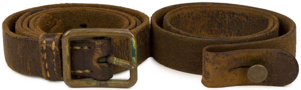 In 1938, the Japanese military gave its contractors authorization to use leather substitutes in the manufacture of enlisted belts, front and rear ammo pouches, bayonet frogs, slings, holsters and other equipment.PHYSICAL DESCRIPTION: Leather example. Comes complete with single pronged metal buckle, 2 leather retaining tang and stud. Sling is broken and will need to be repaired.