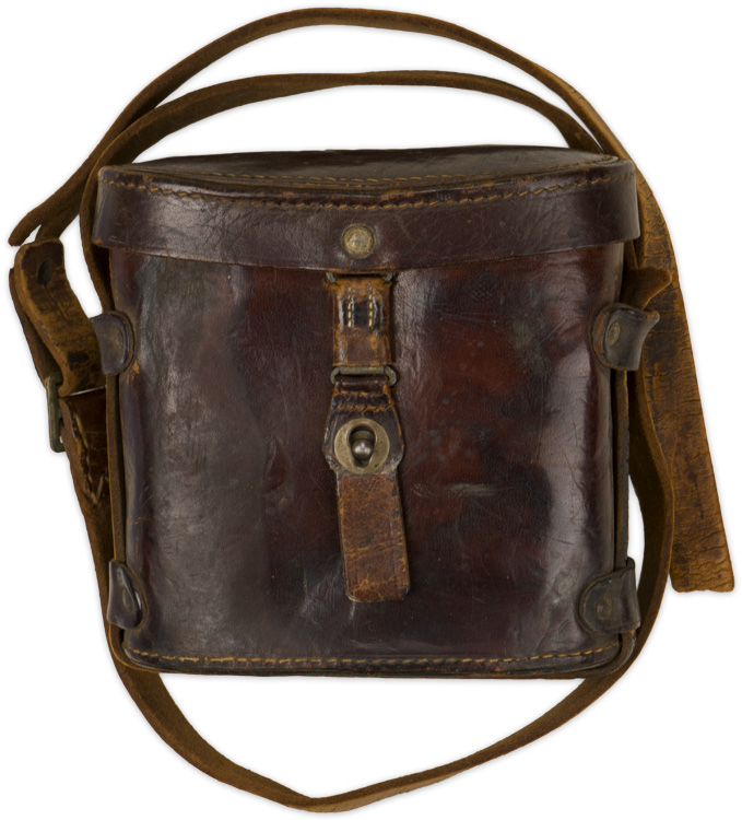 A leather binocular case with a leather hinged lid. The leather strap extends around the body of the case that is secured by a single prong buckle. The strap has torn.