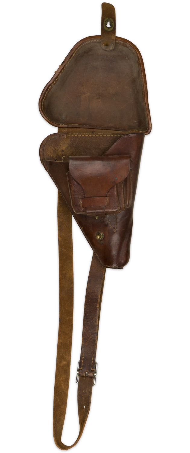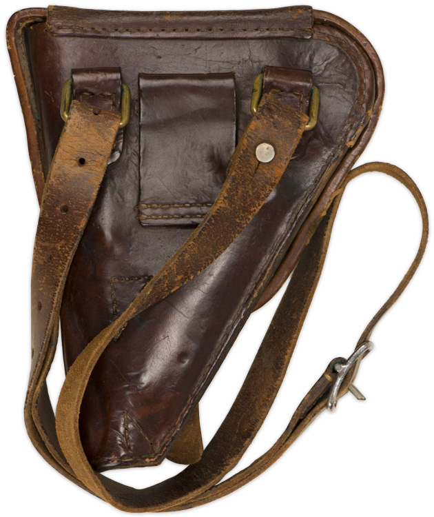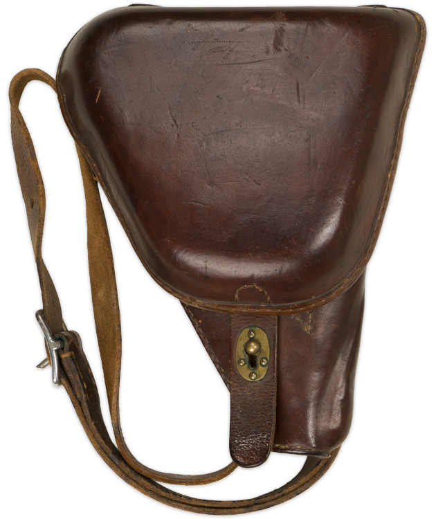 Early reddish-brown, leather, hard shell holster for the type 14. 8mm Nambu pistol. The hard shell fold-over flap is attached to its top by a sewn leather hinge. Original shoulder strap.