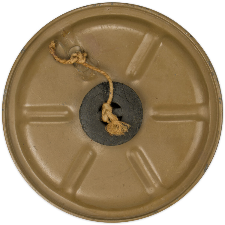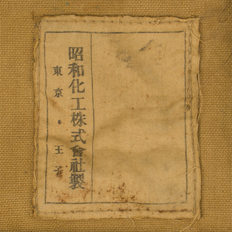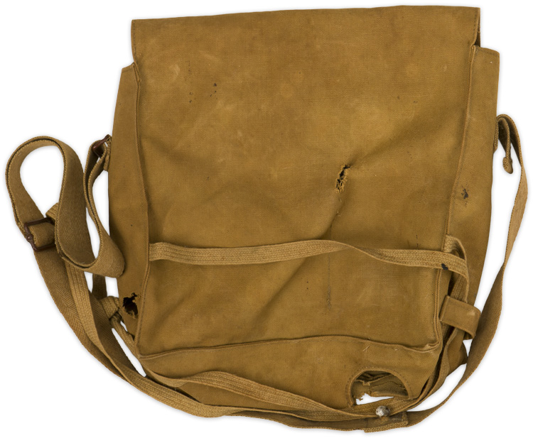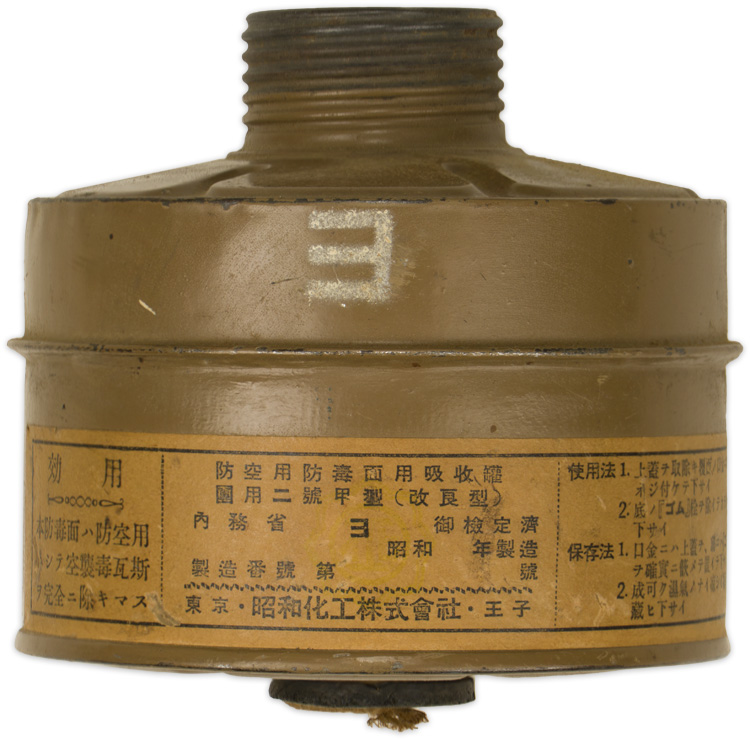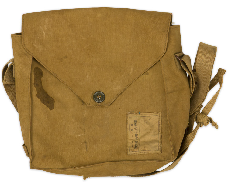 A two piece gas mask with face mask and canister that attached directly onto the face mask. The original plug is in place at the bottom of the cannister. The mask is partially dry, but remains supple. The glass to one rimmed lense is discoloured and crazed. The Type 99 pouch, is not specific to this type of gas mask. It measures approximately 8cm x 23cm x 25cm with adjustable carrying strap and ties to secure to the body. The interior is divided into two sections. There is a reinforced stitched hole to the bottom of the bag and a small printed label sewn to the bottom right corner on the front panel. The carrying pouch shows staining, as well as wear that has caused some holes to the fabric.