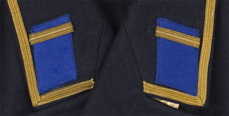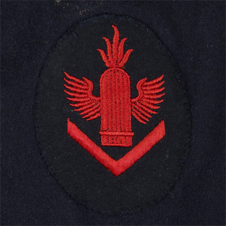 PHYSICAL DESCRIPTION: Nice quality, Kriegsmarine era, deep navy blue doeskin wool construction, three quarter length, double breasted style jacket with fold back peak lapels and a lay down collar. Jacket features two, vertical, parallel, rows of five front closure buttons with corresponding button holes on the left front panel. The fold back peak lapels also have a single button hole to each with a corresponding button hidden beneath each lapel. Right breast has a machine embroidered national eagle in golden yellow threads on a cut-out navy blue wool base. The eagle is neatly handstitched to the jacket. Jacket has two horizontal slash front hip pockets with straight edged flaps. Sleeves have straight cut non-adjustable cuffs. The upper left sleeve has a 1940 pattern specialty insignia consisting of a machine embroidered exploding winged shell situated above a single chevron in bright red threads on a vertically oval navy blue wool base indicating light Flak Artillery specialist. The oval navy blue wool base is handstitched to the sleeve and interestingly has an underlaying stiffener. Lay down collar has the typical zig-zag reinforcement stitching to the reverse. The forward edge of the collar is trimmed in gilt wire, NCO’s rank tress and has plain, cornflower blue wool collar tabs with a small strip of the gilt wire, NCO’s rank tress near the top edge. Tress signifies the rank of Obermaat. Collar tress and tabs are machine stitched to the jacket. The interior of jacket is fully lined in navy blue melton cloth with grey rayon sleeves. Lining has a horizontal slash pocket to both left and right breast panels and heavy internal padding to each shoulder. Lining has faint illegible white inkstamp within a boxy "T" shaped outer border. Although illegible the inkstamp is from one of the Kriegsmarine clothing depots. Jacket shows small areas of light to moderate nap wear, a small handstitched repair and about a dozen small moth nips which are only visible on close inspection. All the buttons are the fire gilted alloy type with embossed fouled anchor on a horizontally ribbed field with simulated twisted rope outer border and most appear to have their original stitching. The reverse of all the buttons have impressed script, "Kriegsmarine" and dates of "1938", and, "1939". Jacket is roughly size 40" chest. Set comes with a nice pair of size 32/34 trousers.