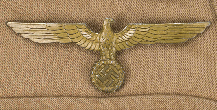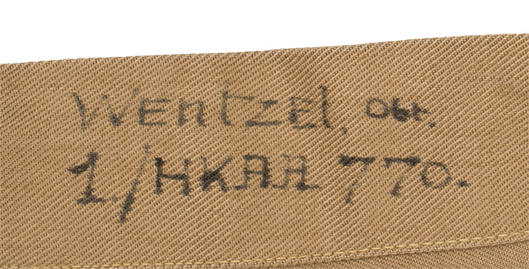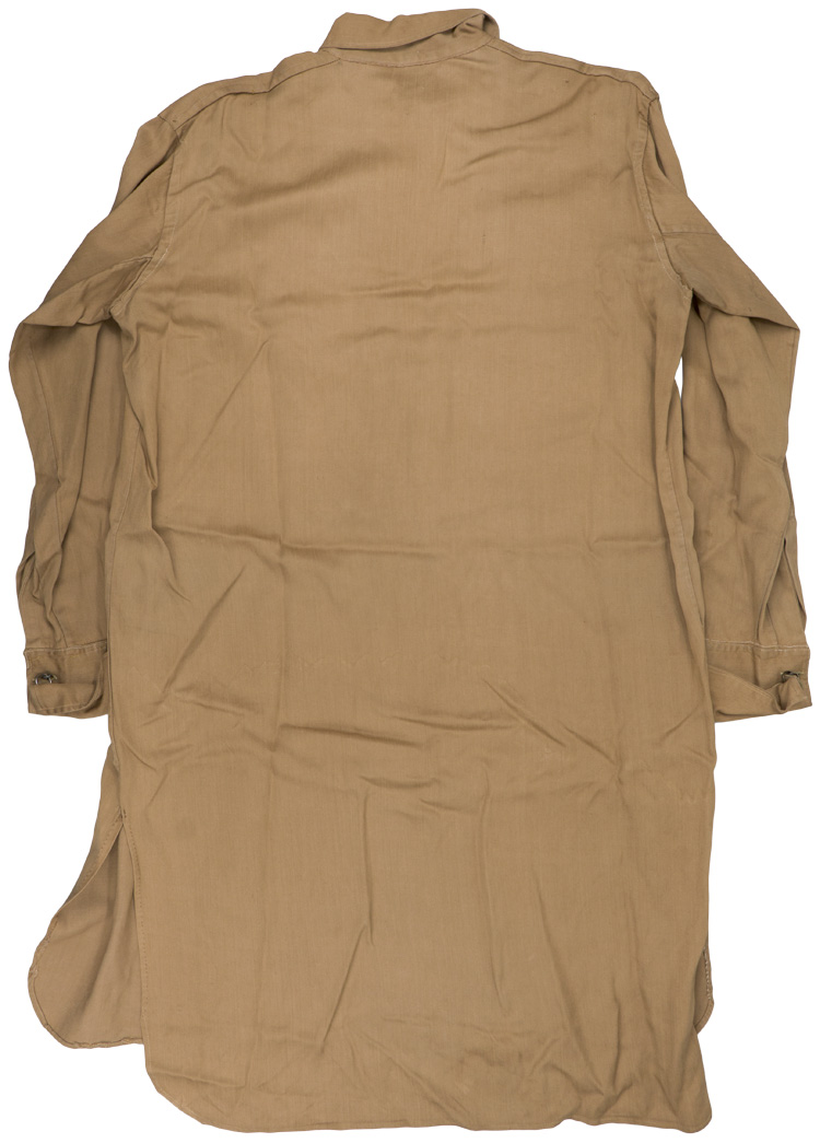 PHYSICAL DESCRIPTION: Early pattern, light weight, tan cotton construction, long sleeve, pullover shirt with an integral lay down collar. Shoulder boards and shoulder board buttons have been removed. Original metal eagle with three original looped attachment threads. Buttons are all restored. Interestingly there is an outline of a “cloth” EK1 that was sewn to the left chest at some point. Roughly a size 44 chest.