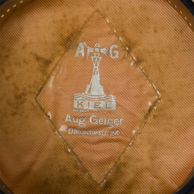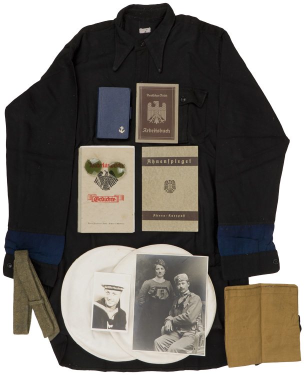 A fourteen-piece grouping, all from the estate of one Kriegsmarine veteran, consisting of his "Donald Duck" cap with two extra covers and a period photograph of him wearing it, a postcard from a military hospital, the employment record book of his wife, a book of poetry with National Socialist themes, an ancestry pass tracing his family lineage, a navy date book, a dark blue wool shirt and a field grey wool belt, sunglass lenses, a cotton sack, and a first world war era photograph of his father and mother. The German "Donald Duck" sailor’s cap ("Mannschaftsmütze" (Enlisted-cap), "Tuchmütze" (Cloth-cap), or "Dienstmütze" (Service-cap)) was based on traditional designs that date back to the creation of the Prussian Navy in 1848. The cap underwent numerous minor modifications during the intervening years, including the introduction of a cap with removable, interchangeable, white and blue covers in 1926. In 1931 a final pattern was established that remained in use until the end of WWII, with the only alterations then being to the insignia and cap tallies worn. The Weimar Reichswehr era oval cockade (in black, red and gold) was replaced with a new, circular cockade (in black, white, and red) in 1933. In 1934 the Kriegsmarine adopted a new national eagle on the front of the headgear and to the right breast of the uniform. 1936 regulations replaced the previously used gilt wire thread for the script on the cap tallies with golden yellow celleon threads, and in 1938 the "Kriegsmarine" titled cap tally was introduced for wear as a security measure in the case of mobilization; with the wear of named cap tallies restricted to barracks and on ships only if there was no possibility of them being seen by outside personnel. Additional regulations in mid-1940 withdrew all named cap tallies from further wear, to be replaced with the "Kriegsmarine" cap tally, for the duration of the war. The cap’s 11 1/2" diameter white canvas crown has the stitched outline of a name tag visible to its exterior center, and has 2 1/4" deep sides with seams to each of its cardinal points. The front center of the cap has fixed to it a stamped alloy, fire gilted national eagle, slightly convex and with a 2" wingspan, to which is connected a three-piece national tri-color cockade with a 7/8" diameter base. The eagle retains all of its fire gilting, with minor age dulling. The three-piece cockade consists of a black fluted base, and a silver-washed alloy roundel with a red felt dot to its center. Approximately 40% of the silver wash remains to the roundel. A 1 3/4" rifled vertical pin descends from the hollow back of the head of the eagle. Soldered to the hollow back of the wreathed swastika is a vertical tab with perforations which accepts the dual prongs to the back of the cockade. Stamped to this alloy tab is "D.R.G.M.," for "Deutsches Reichsgebrauchsmuster" (German Registered-design). The approximately 1 1/2" black headband has a 1 1/4" black silk cap tally with the machine woven Gothic script "Marineartillerieabteilung" (Marine-Artillery-Section), in gilt wire threads, to it. The horizontal cap tally has a vertical seam to its reverse to either side of which descend 16" vertical "tails" in the same width and of the same material as the tally. The ends of each of these "tails" are cut diagonally. The interior of the cap is fully lined in copper-colored rayon and features, to the center of its crown, a celluloid sweat diamond underneath of which is stamped, in silver, a light-buoy with "A" and "G" to either side of its light and "KIEL" to its base. "Ges. gesch." ("Gesetzlich geschützt;" protected by law) and the manufacturer’s name and address, "Aug. Geiger Dänischestr. 24," is beneath the image. The 1 3/4" brown leather sweatband has a white ribbon threaded through the numerous small vertical slashes above and along its edge and is tied to the reverse. An approximately 7 1/4" x 1/2" horizontal section of cork is beneath the sweatband to both the front and rear. The original wire stiffener may be seen along the interior circumference of the crown. Light age soiling is evident to the white cover, the inscription to the tally has lost its luster, one of its "tails" has two small holes to it, the interior crown is lightly soiled and has two small holes to it, and the interior sweatband has noticeable wear and soiling to it. Each of the cap’s two extra white canvas covers have approximately 11 1/2" diameter crowns and 2 1/4" deep sides with seams to each of their cardinal points. One has stitch outlines to the center of the interior crown, where a name tag was evidently removed. The other retains its original stiffening "wire," of some sort of flexible softwood, which runs along the circumference of the crown. Both of the covers exhibit light age soiling, with some noticeable small spotting, but retain all of their original stitching. Also included is a 3 9/16" x 5 1/2" black-and-white portrait photo postcard of the smiling original owner, in uniform, wearing the very same cap. To its reverse are lines for an address, "Fotohaus Petrykiewicz, Villach-Millstatt," and an indecipherable, handwritten pencil annotation. Slight age yellowing is visible, but the card is in otherwise excellent condition. Next in the grouping is a 4 1/8" x 5 3/4" printed paper postcard to whose obverse is the sepia-toned illustration of a sea-side arching road with two defensive towers and several smaller buildings along its route. "Wachen Und Warten Abwehren Und Abschiessen" (Watching And Waiting Warding-off And Shooting-down) is printed to the base of the illustration, and "Tag der Wehrmacht 20./21. März 1943" (Day of-the Armed-forces 20./21. March 1943) is inkstamped to its top. To its reverse is printed "Feldpost," beneath which are lines for an address, and "Mar. Erholungsheim Oberweissbach" (Marine Convalescent-home Oberweissbach) is inkstamped vertically to the left. Light age yellowing and very light age soiling may be seen. A first 