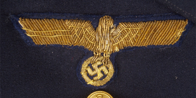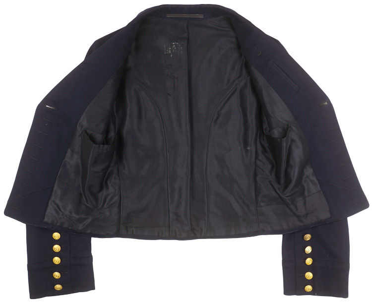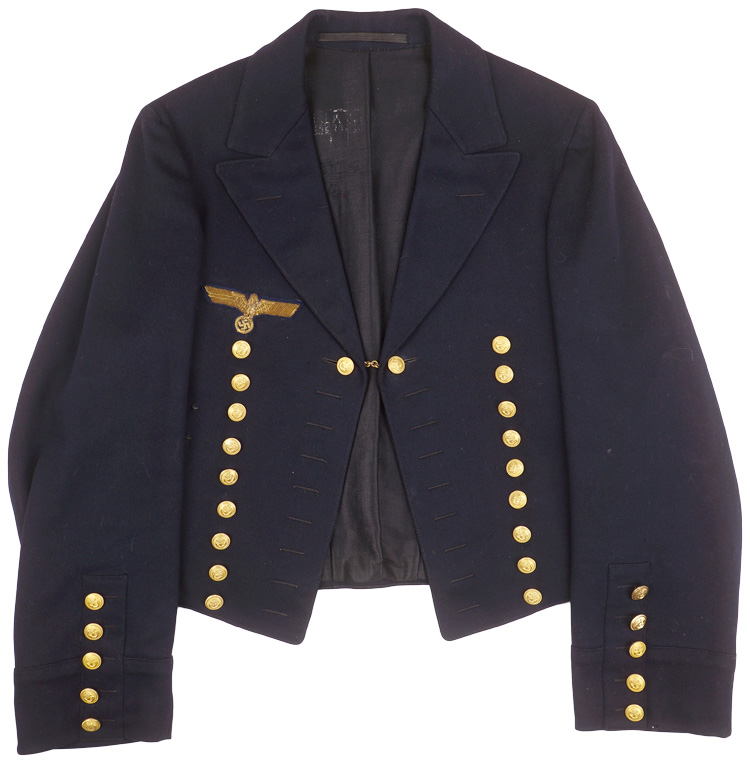 PHYSICAL DESCRIPTION: Nice quality, navy blue doeskin wool construction, waist length, Bolero/Spencer style, simulated double breasted, parade jacket with opened, upswept, peak lapels and a small lay down collar. The jacket has a central, vertical, front opening with nine, stitched button eyelets to each side. Only the top button eyelets are cut opened and the lower eight are just ornamental. The jacket was designed to remain open with a retaining, shackle chain, with dual buttons, worn through the top button eyelets. The shackle chained, closure buttons are included. The jacket features a vertical, parallel row of nine ornamental buttons to each side of the front breast panels with an additional button positioned beneath each lapel. The right breast has a hand embroidered, national eagle in gold bullion wire on a cut-out navy blue wool base. The eagle is neatly hand stitched to jacket. The upswept peak lapels have an closed stitched, ornamental button eyelet to each side. The straight cut, non-adjustable, sleeves have "Brandenburg" style cuffs with dual-ply, horizontal, simulated French cuffs and a small, vertical panel to the forward edge with six, vertically aligned, ornamental buttons simulating an open slash. The jacket has no rank or career trade sleeve insignia. The jacket also has no shoulder straps/boards or collar tabs as per regulations. The interior of the jacket is fully lined in black rayon with off-white, blue and red striped sleeves. The lining has a horizontal slash pocket to both left and right breast panels and an additional, small, diagonally angled, slash pocket to the left breast panel. The buttons are all the fire gilt, stamped alloy type with an embossed fouled anchor on a horizontally ribbed field with simulated twisted rope outer border and all appear to have their original stitching. The jacket is roughly a size 38" chest. Nice clean jacket.