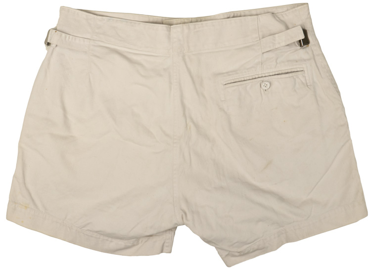 PHYSICAL DESCRIPTION: Light weight white cotton twill construction short pants feature a vertical, four button French fly with An additional two at the waistband. The shorts have two, diagonally angled, slash front pockets and a small, horizontal watch pocket situated just below the right front waistband.There are no longer any visible markings, they are most probably there but now obscured by age or wear. The shorts are roughly size 34/36" waist.