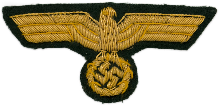 PHYSICAL DESCRIPTION: Hand embroidered national eagle in gold celleon threads on a cut-out blue/green badge cloth base. The reverse of the base still has its original protective backing intact. Very hard to find eagle!