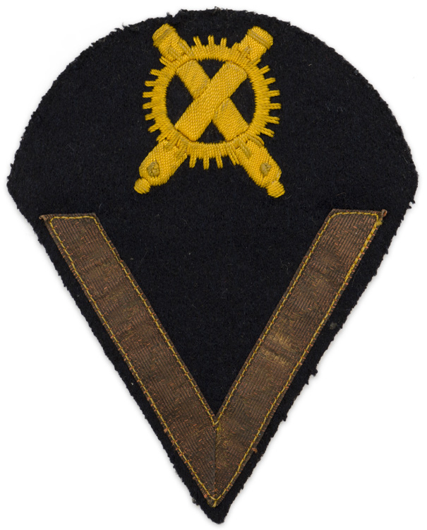 PHYSICAL DESCRIPTION: The insignia consists of a navy blue wool base with an inverted triangular bottom and a semi-circular top. The top of the base has machine embroidered, multi-cogged wheel superimposed on crossed artillery barrels in golden yellow threads positioned above a single rank chevron. The rank chevron is machine stitched to the wool base.