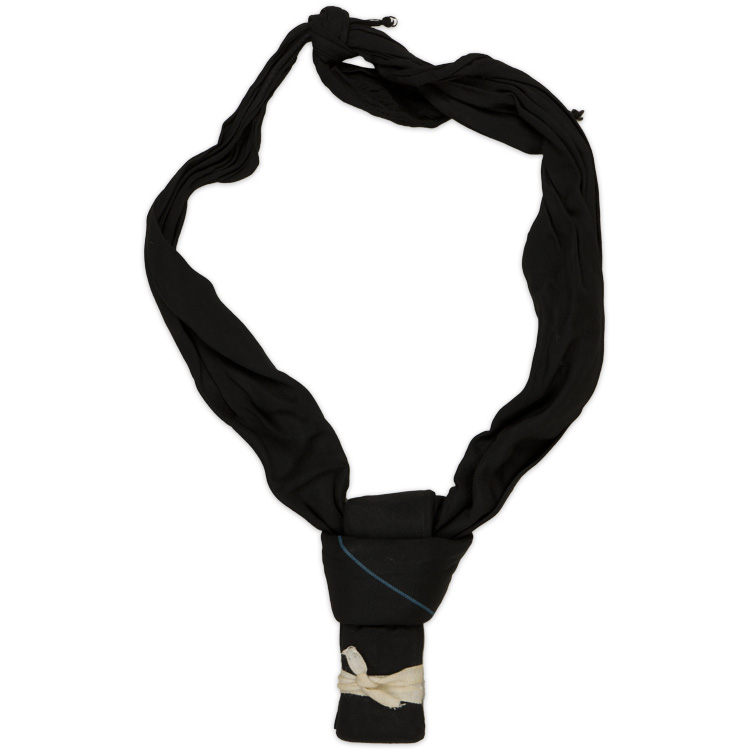 PHYSICAL DESCRIPTION: A black, knotted, silk/rayon scarf.