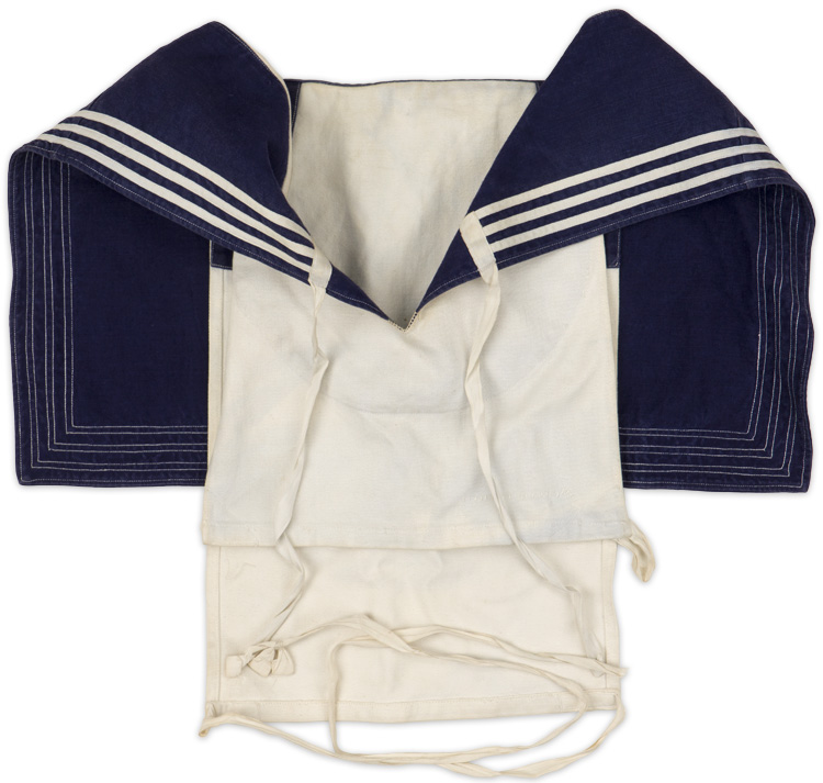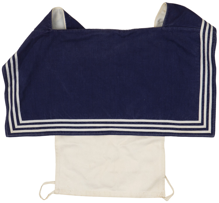 PHYSICAL DESCRIPTION: The collar dickie consists of a rectangular, white cotton construction, breast and back panels with a fold back mid-blue "nankeen" collar. The back panel has a tie tape to each bottom corner and the breast panel has two, small, tie tape loops allowing the dickie it to be tied around the wearer’s body underneath his shirt with the fold back collar hanging over the exterior back of the shirt. When the collar is folded back in the proper position it creates a "V" slash at the forward neckline. The upper breast panel also has two tie tapes situated at the top edges of the "V" slash to secure the neckerchief to the dickie. The fold back collar has three roughly, 5mm wide, parallel white cotton strips machine stitched near all three outer edges.
