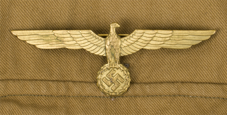 PHYSICAL DESCRIPTION: Nice quality, private purchase, 1940 pattern, mid-weight, tan, cotton construction tunic with a pronounced, vertical ribbing, features a vertical, five button front closure with small fold back lapels and a lay down collar. The tunic has four pleated, patch, front pockets with scalloped button down flaps. The right breast has two, small, vertical and one horizontal thread loop for securing a removable breast eagle. The tunic comes with a removable, gilt washed, alloy construction national eagle with out-stretched wings, clutching a wreathed, canted swastika in its talons. Eagle is in nice complete condition. The side panels each have a single, stitched eyelet positioned at the waistline, for the belt support hooks. The straight cut, non-adjustable sleeves have dual-ply, simulated French cuffs. The tunic has nine, stitched, ventilation eyelets to each armpit. Comes with a nice pair of slip on Oberfeldwebel’s Engineers shoulder straps. The lay down collar has no collar tabs as per regulations. The unlined interior has small, ribbed, cotton twill reinforcement panels at the armpits and two, vertical, ribbed, cotton twill straps with dual stitched eyelets to each for the belt support hooks. Buttons are the removable type and are all in nice condition. The tunic is roughly a size 38" chest. Nice tunic!