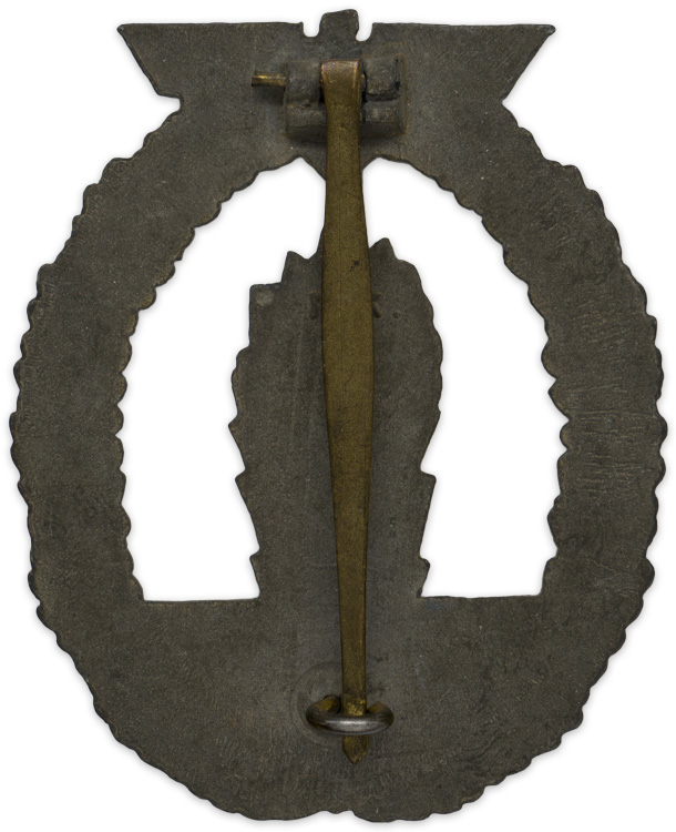 PHYSICAL DESCRIPTION: Solid backed, zinc construction badge with gilt and frosty silver washes. The badge is in the form of a gilt washed, vertically oval, oak-leaf wreath with a national eagle, with outstretched wings, clutching a canted swastika superimposed to the top center, encompassing frosty silver washed, horizontal waves and a cut-out, vertical, exploding, water funnel. The reverse of the badge has an integral, solid block type hinge, a broad, tapering, vertical pin and a soldered catch on a circular base plate inset into a circular recess all intact. The reverse is well marked with embossed manufacturer's initials, "R.K.", indicating manufacture by Rudolf A. Karneth & Sohn, Gablonz.