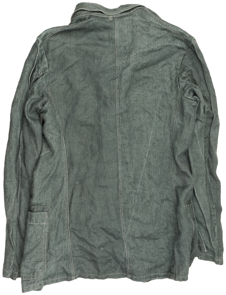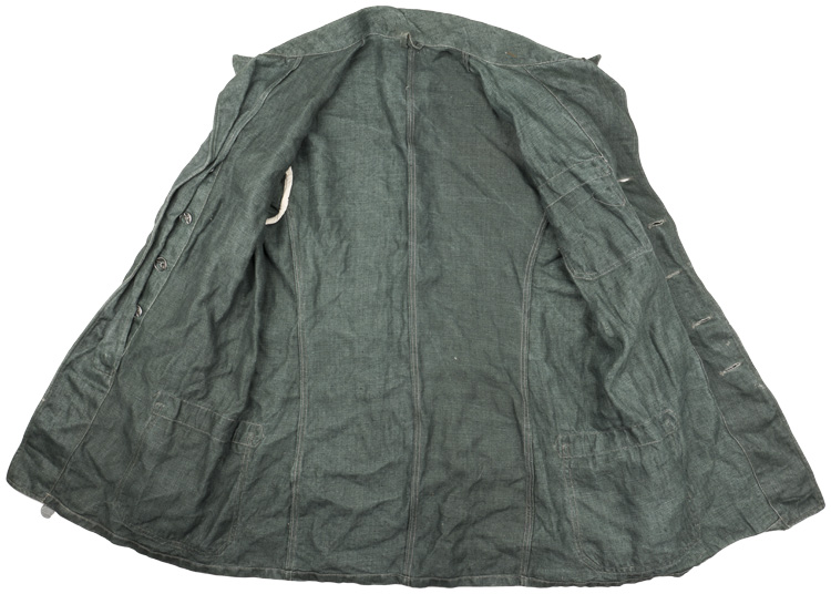 PHYSICAL DESCRIPTION: Green cotton/rayon blend construction work/drill tunic with an HBT weave. Tunic features a five button front closure with an open lay down collar. Tunic has two, non-pleated, patch hip pockets with non-flapped horizontal slash openings. Sleeves have straight cut, non-adjustable cuffs. Tunic has no insignia and no evidence of any ever having been applied. Lack of insignia indicates usage by enlisted personnel, as per regulations. Front closure buttons are the field-grey painted, stamped alloy type with an embossed fouled anchor on a pebbled background field with a raised outer rim. The front has come off one button, but is included. Buttons are the removable type with "S" ring retainers and retain all of their original field-grey paint. Roughly a size 36" chest. Nice clean example.