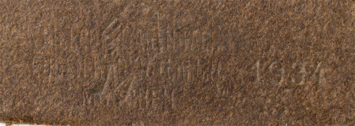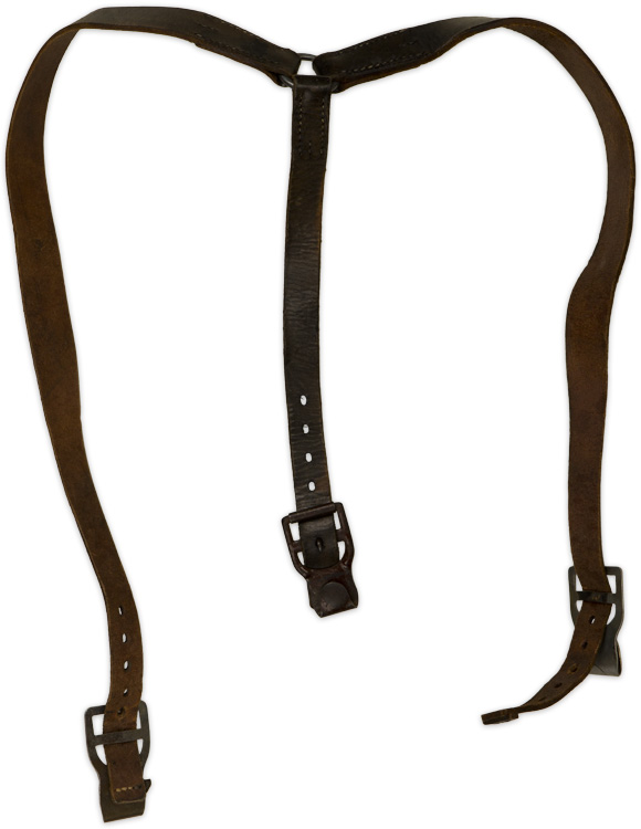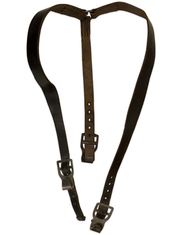 PHYSICAL DESCRIPTION: Early, blackened leather construction Y-straps, consisting of two front straps and a short back strap with metal fittings. Nicely maker marked with an early 1934 date. Straps are complete and in decent condition. Nice early straps.