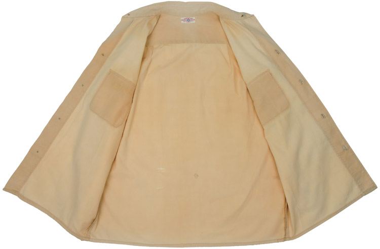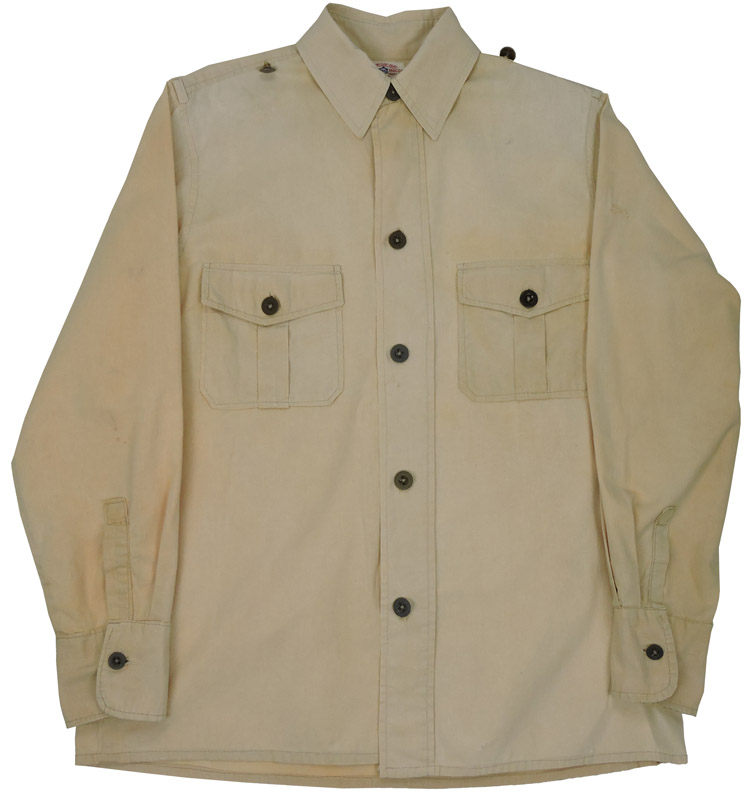 1920's or early 1930's German private purchase tan cotton tropical shirt for the Reichsmarine (I think). German cotton rectangular makers label in the collar states it is guaranteed Egyptian cotton. Long sleeve shirt with two pockets, green buttons, and small green Reichsmarine (or maybe older Kaiserliche Marine) buttons and cotton loops for shoulder straps (that had narrow tongues) on the shoulders. This shirt is extremely heavily sun-faded; it was once a mustard color like that used in issue colonial uniforms (i.e., Kolonial Amt issued) for colonial troops (Schutztruppe). The only hint of the original mustard color now is down inside the pockets (photo). Possibly even pre-WW1 vintage officer's private purchase. An unusual shirt in that it buttons down the front the whole way while, except dress shirts for formal events, most German shirts of this period only buttoned half way down the front. Chest size 36".