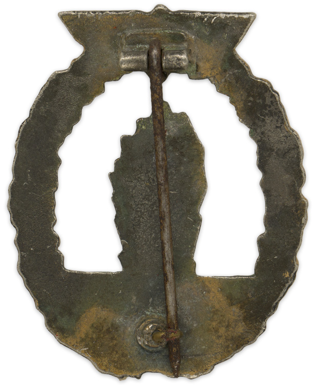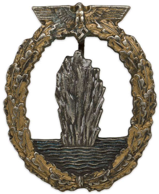 PHYSICAL DESCRIPTION: Solid backed, alloy construction badge with gilt and frosty silver washes. The badge is in the form of a gilt washed, vertically oval, oak-leaf wreath with a national eagle, with outstretched wings, clutching a canted swastika superimposed to the top center, encompassing frosty silver washed, horizontal waves and a cut-out, vertical, exploding, water funnel. Complete pin and catch assembly.