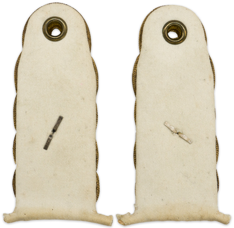 PHYSICAL DESCRIPTION: Pre 1938 pattern, pass through style shoulder boards with interwoven, bright, silver/aluminum and gilt wire Russian braids, stamped alloy rank pip all mounted on white wool bases.