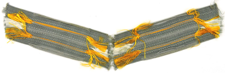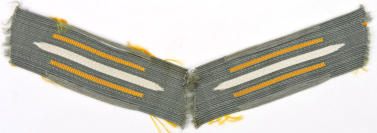 PHYSICAL DESCRIPTION: Machine woven rayon construction collar tabs features light, field-grey litzen with an interwoven white center stripe and yellow branch of service stripe. Mint and nice!