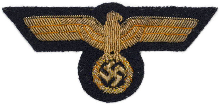 NSDAP’s, Nationalsozialistische Deutsche Arbeiterpartei, (National Socialist German Worker’s Party), national eagle for wear on the front of the headgear and the right breast of the uniform on March 24TH 1934. The Kriegsmarine’s version of the national eagle was identical to the army version except for the coloration with the army utilizing silver, white and grey eagles while the Kriegsmarine utilized golden yellow eagles. Of Note: The only exceptions in the coloration of the Kriegsmarine cap eagles was that personnel serving in the Administrative branch utilized a silver eagle while