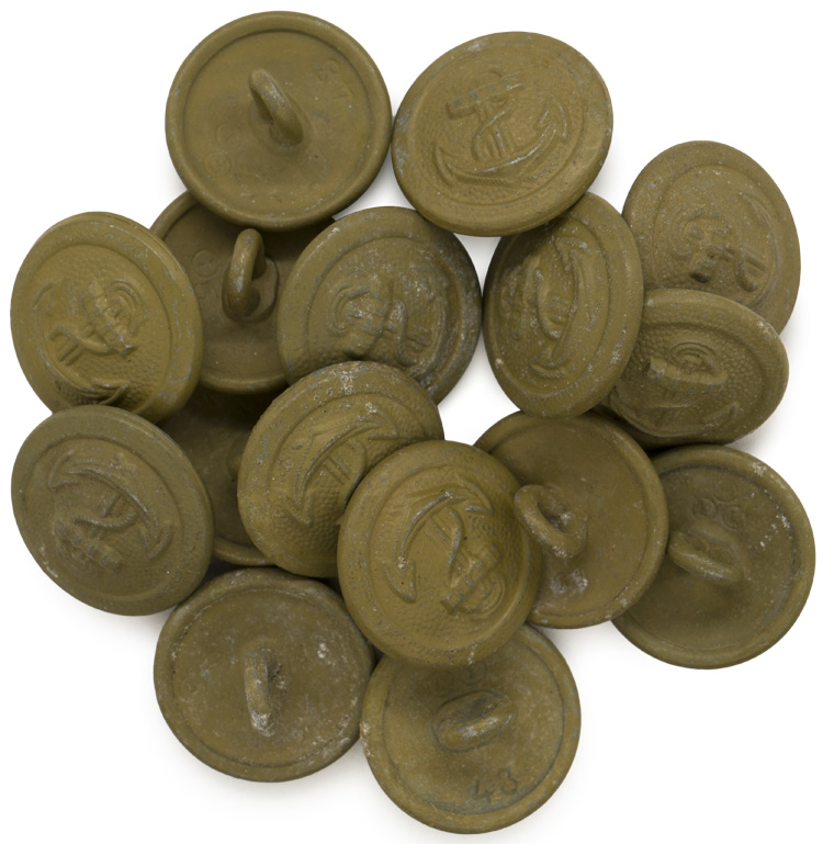 BACKGROUND: Although the Kriegsmarine utilized a wide variety of different style and sized buttons on its assorted uniform items the most commonly used uniform buttons were the 25mm, (1") and 20mm, (3/4"),diameter, magnetic sheet metal or alloy type buttons. The standard navy blue and white uniform buttons featured an embossed fouled anchor on a horizontally ribbed background field with a simulated, twisted rope, outer border while the standard uniform button for the field-grey uniforms featured an embossed fouled anchor on a subtly pebbled background field and a raised pebbled outer rim. The buttons for the navy blue and white uniform were generally gilted while those of the field-grey uniforms were field-grey. Administrative personnel were distinguished from other Kriegsmarine personnel by having silver uniform insignia including buttons as opposed to the standard golden yellow insignia. Due to the silver insignia the Administrative personnel were contemptuously referred to as Silberlinge, (Silvered Ones).