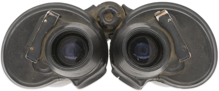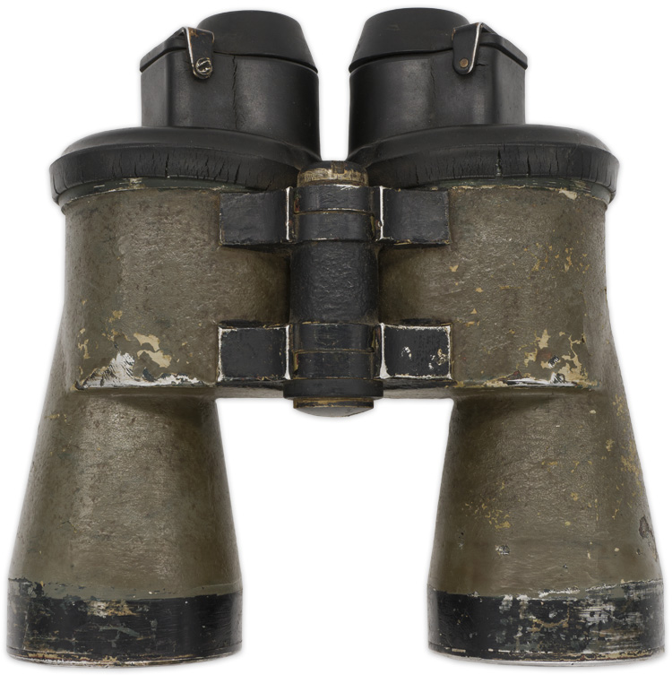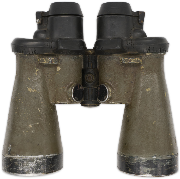 PHYSICAL DESCRIPTION: Cast alloy construction binocular bodies with brass fittings and water-proofing protective rubber seals to ocular ends. Field-grey paint which is retained about 75%. Rubber seals to ocular ends have separate raised eye sockets with small alloy retaining clips. Rubber seals to both ends show edge cracking but are fully intact. Optics are crisp and clean. Right hand side ocular end well marked with stamped designation, "7x50", (7 power magnification with a 50mm diameter objective lens), serial number, "38531", and manufacturers code, "blc", for Carl Zeiss Jena. Scarce U-Boat crew type.