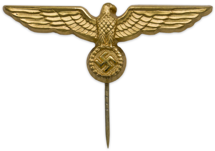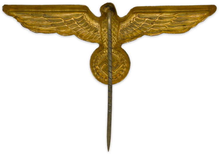 PHYSICAL DESCRIPTION: Gilt washed, alloy construction, national eagle features out stretched wings and is clutching a wreathed, canted, swastika in it’s talons. Original pin. Nice clean example!