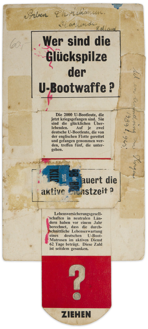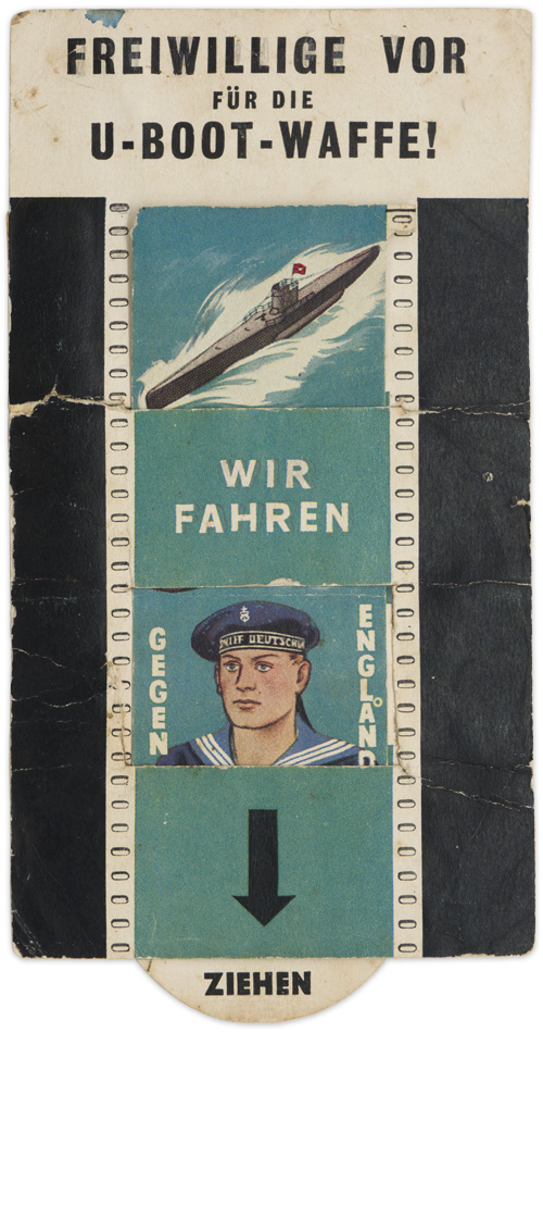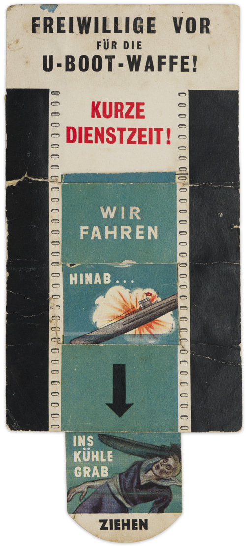 Original WW2 British Leaflet “Freiwillige Vor für die U Boot Waffe!”. British interactive leaflet for German civilians. When pulled, the U boat explodes, and the Kriegsmarine sailor dies. Has one tear and several folds but still functions.