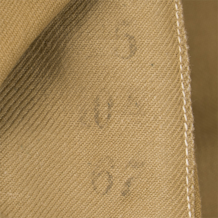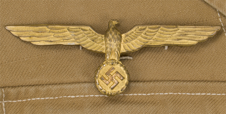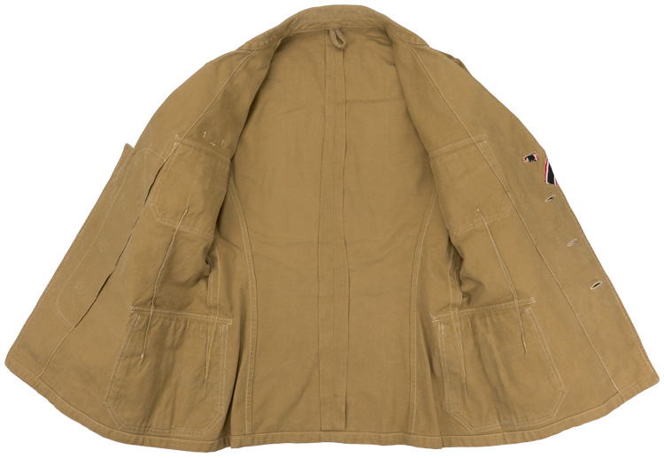 PHYSICAL DESCRIPTION: 1940 pattern, mid weight, tan, cotton construction tunic with a pronounced, vertical ribbing, features a vertical, four button front closure with small fold back lapels and a lay down collar. The tunic has four pleated, patch, front pockets with scalloped button down flaps. The right breast has two, small, vertical and one horizontal thread loop for securing a removable breast eagle. KVK2 ribbon. The tunic comes with a removable, gilt washed, alloy construction national eagle with out stretched wings, clutching a wreathed, canted swastika in its talons. The left breast has horizontal thread loops for wear of one award. The straight cut, non adjustable sleeves have dual ply, simulated French cuffs. The tunic has “pass-through” shoulder boards in bright, silver/aluminum Russian braid with a single gilt washed, stamped alloy rank pip to each, mounted on dark navy blue wool bases. The lay down collar has no collar tabs as per regulations. The buttons are all the tan painted and the “S-Ring” removable type. The tunic is roughly a size 34" chest. Shows the expected period use and wear but overall nice condition.