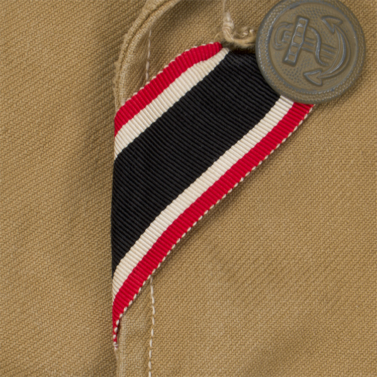 BACKGROUND: German Naval uniforms and headgear were based on traditional designs that date back to the creation of the Prussian Navy in 1848, and although the uniforms and headgear did evolve during the interim years, many items used during the Third Reich would still have been quite recognizable to the Imperial sailor. The German navy also had a long tradition of brown and white tropical/landing dress that was worn in hot climates with the white uniform also serving as a walking out dress. The tradition was continued through the Weimar era and in 1929 the Reichsmarine introduced new brown and white tropical/landing dress uniforms with stand up collars. In 1937 the Kriegsmarine introduced new style brown and white tropical uniforms with lay down collars. With the impending entrance into the North African campaign in late 1940 the Kriegsmarine developed another new tropical brown uniform independently from the Heer and Luftwaffe, but retained the 1937 pattern white uniform. Included with the 1940 pattern tropical brown uniform were service tunics, field blouse and both short and long pants. The tropical uniforms were classed as Sonderbekleidungsstücke, (Special Articles of Clothing), and were only issued to personnel serving in tropical climates. Officers and certain senior NCO ranks were responsible for purchasing their own uniforms and headgear and as a result were allotted a clothing allowance through the OKK, Offizier Kleiderkasse der Kriegsmarine, (Officer’s Clothing Account of the Navy). Although enlisted personnel were issued their uniforms and headgear from government supplies they were also permitted to purchase privately tailored items although the price may have been restrictive. Generally speaking officers bought nice quality, private purchase, uniform items but they could also choose to buy their uniforms directly from the military clothing depots.