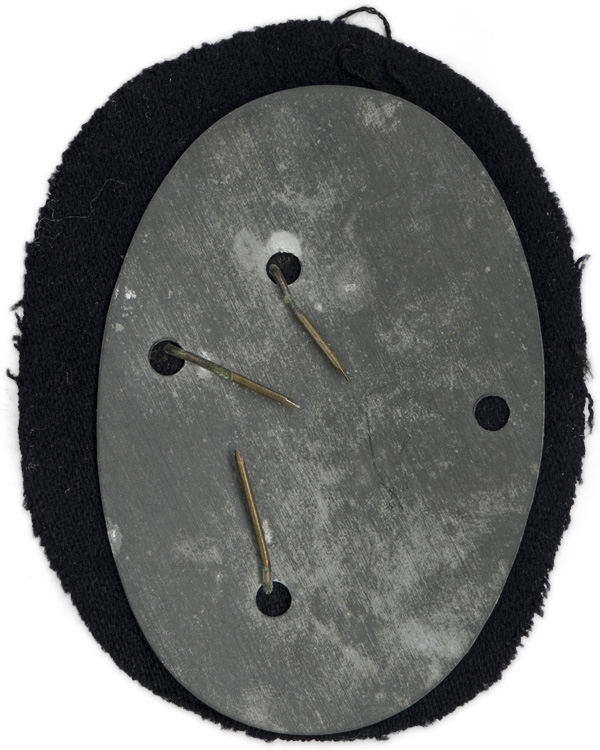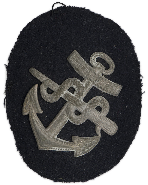 PHYSICAL DESCRIPTION: The insignia consists of a roughly, 90mm tall, 70mm wide, vertically oval, coarsely woven, navy blue wool base with a diagonally angled, single piece, gilt washed, stamped alloy, Asklepian, (serpent intertwined on a staff), superimposed, on a diagonally angled anchor. The reverse of the insignia still has its alloy base plate intact. Looks to be one missing prong.