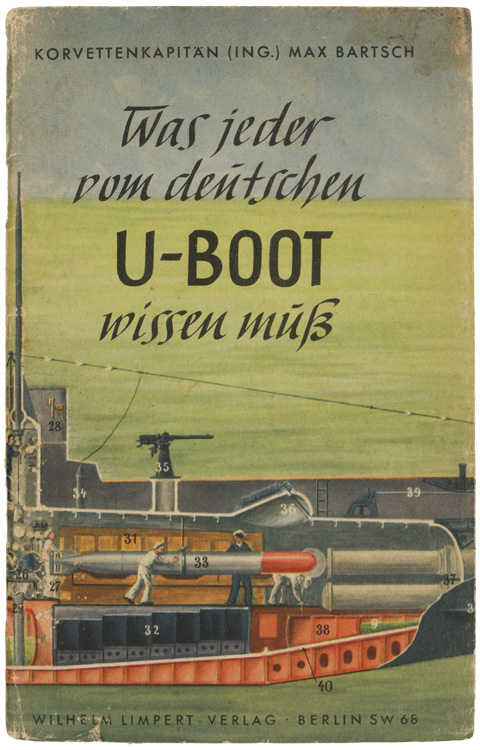 PHYSICAL DESCRIPTION: Roughly 20cm x 13cm, forty page, unofficial training book compiled by, "Korvettenkapitän (Ing.) Max Bartsch", and published by, "Wilhelm Limpert", in Berlin in 1940. The mid-weight card stock cover of the book has a full color, cut-away drawing of a submarine with all the components numerically marked, from one to forty, with a corresponding glossary list of the individual components. The front cover also has the black printed title, "Was jeder vom deutschen U-Boot wissen müß", (What every German U-Boat Personnel must know). The text examines all the basic information required for personnel serving on a U-Boat including both offensive and defensive weapons. The book has five black and white photographs and three line drawings that reinforce the text. The book is in overall good condition with the pages showing minor age yellowing but they are all intact.