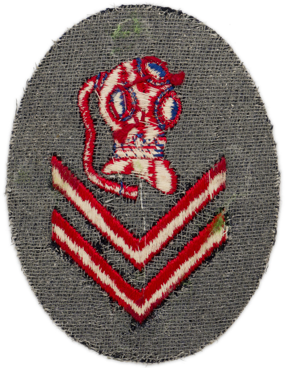PHYSICAL DESCRIPTION: The 1940 pattern insignia consists of a roughly, 95mm tall, 70mm wide, vertically oval, navy blue wool base with a machine embroidered, divers helmet positioned above dual chevrons in bright red cotton threads with mid-blue, detailing, accent threads to the helmet.