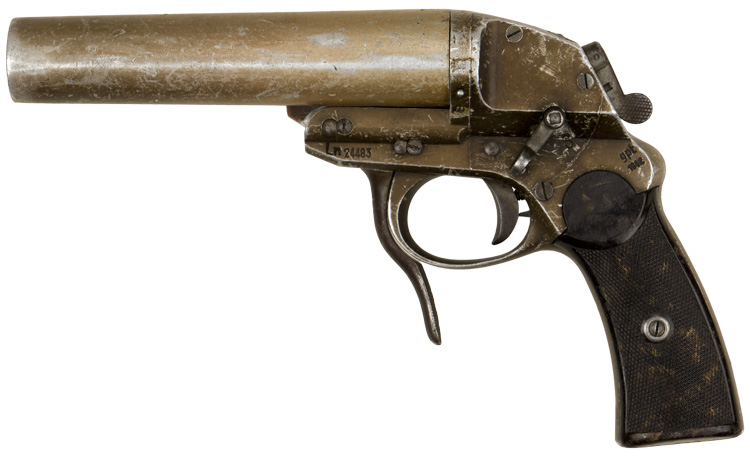 BACKGROUND: The German armed forces utilized two basic models of flare pistols, with one having a short barrel and the other a long barrel, that were introduced in 1928 and saw service right up until the end of the WWII. Both of the basic flare pistols were issued with a specific holster and were capable of firing over forty assorted flares with different functions and purposes. During the war additional expedient models of flare pistols were produced and captured enemy stocks and WWI pistols were also utilized. Besides the two basic models of flare pistols the Luftwaffe also developed a double-barrel model flare pistol.