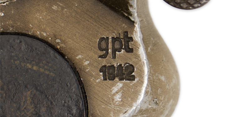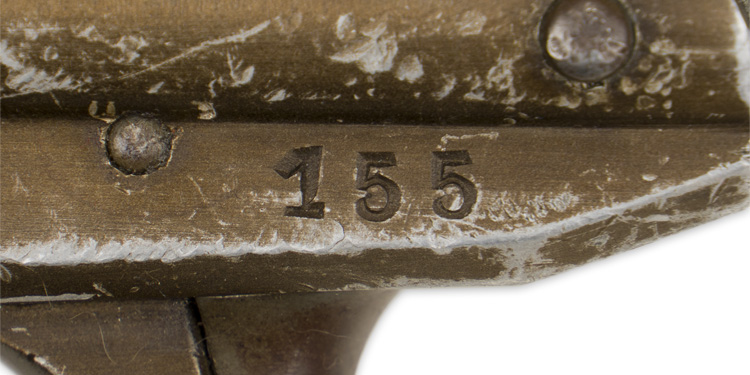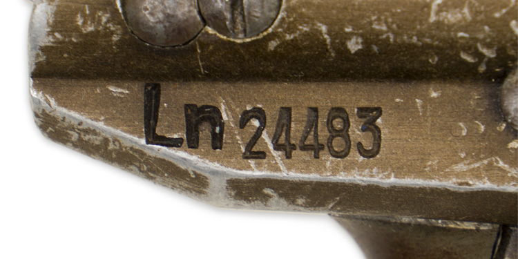 PHYSICAL DESCRIPTION: Tooled alloy construction double barreled flare pistol with a protective copper toned lacquered finish and steel and bakelite fittings. The pistol feature dual, roughly, 16.5cm long, 25mm diameter, tooled alloy barrels with a hinged receiver end. The bottom edge of the receiver has dual, pull back triggers with an integral trigger guard. The triggers may be activated individually or in unison as so desired. The forward edge of the trigger guard has an additional push, finger lever which activates an internal barrel locking mechanism and also enables the barrel hinge to be folded forward to load the pistol. The top reverse edge of the receiver has a three position, movable switch which enabled the operator to select either the left or right barrel respectively or the central position which would activate both of the barrels simultaneously. The left side of the receiver has a two position movable safety/fire switch. The trigger, barrel selection switch and the safety/fire switch all still function. The pistol has molded black bakelite grips with a repeating, embossed, diamond pattern for a secure grip. The grips are attached to the pistol by a single, flush, screw headed bolt. The pistol is well marked with stamped Waffen-amts, Luftwaffe requisition number, "Ln24483", serial number, "155", and manufacturers code and date, "gpt 1942".