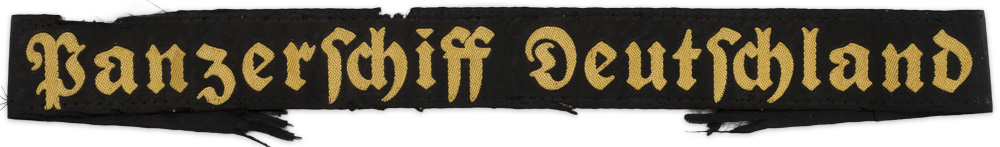 PHYSICAL DESCRIPTION: Post-November 1936, pattern, woven black rayon construction cap talley with machine woven Gothic script, "Panzerschiff Deutschland", in gold celleon threads. Talley has been cut to 49cm and looks to have been sewn to a trophy blanket at one time.