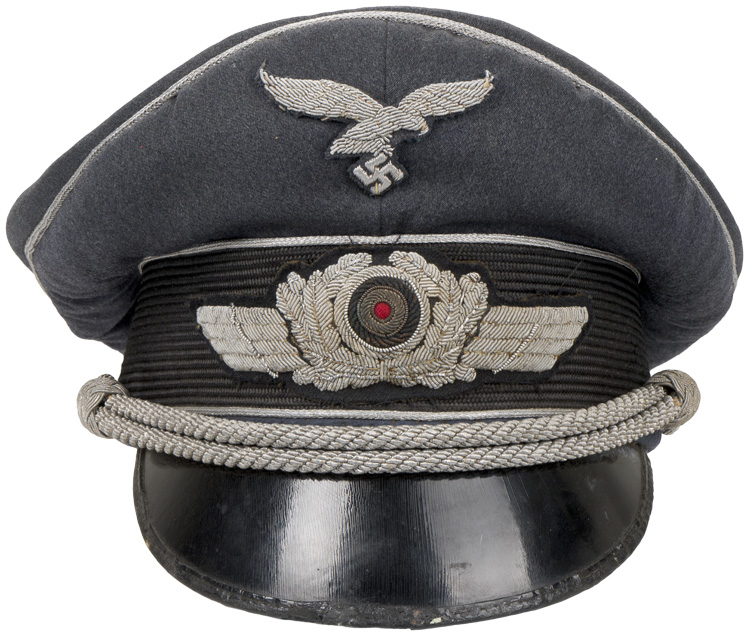 PHYSICAL DESCRIPTION: Nice quality, private purchase, Luftwaffe blue/grey, wool/rayon blend construction visor cap with a subtle, whipcord weave features a black, horizontally ribbed, interwoven, mohair centerband, and bright, interwoven silver/aluminum piping to the crown edge and both the top and bottom edges of the centerband. The front center of the cap has a hand embroidered, second pattern, Luftwaffe eagle clutching a canted, swastika in one talon, in bright, silver/aluminum wire threads with bright, silver/aluminum bullion and tan accent threads mounted on a cut out, Luftwaffe blue/grey wool base. The eagle is neatly handstitched to the cap. The front center of the centerband has a hand embroidered, winged, oak leaf wreath in bright, silver/aluminum wire threads with bright, silver/aluminum bullion, black and tan accent threads, encompassing a hand embroidered national tri color cockade. The national tri color cockade is constructed in black and bright, silver/aluminum wire threads with a red wool center dot. The winged wreath and cockade are mounted on a cut out, black wool base which is also handstitched in place. The cap has an interwoven, twisted, silver/aluminum, braid, chin cord which is secured to the cap by two, small, silver washed, pebbled, magnetic sheet metal buttons. The cap has a extended, forward, blackened lacquered, vulcanfiber visor with a subtly raised lip near the top of the forward edge. The interior of the cap is fully lined in golden tan rayon. The interior crown lining has a clear celluloid sweat rhomboid fully intact. The interior of the cap also has a wide, grained, brown leather sweatband with ventilation perforations to the front forehead section. The sweatband has script with the manufacturer’s acronym, "Erel", and, "Stirnschutz", (Forehead Protection). Roughly a size 58.