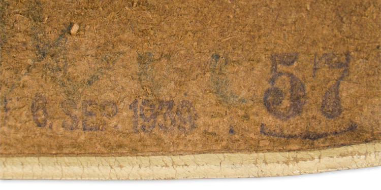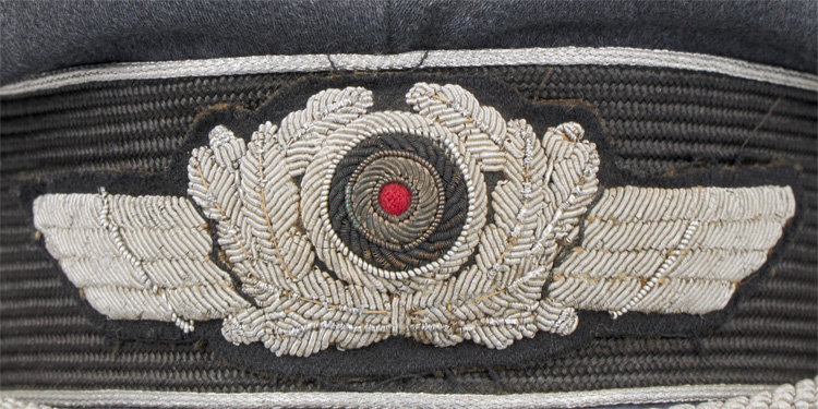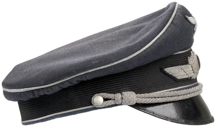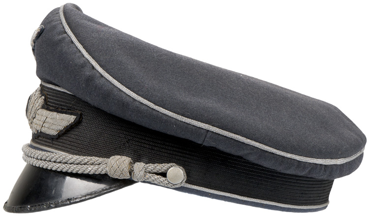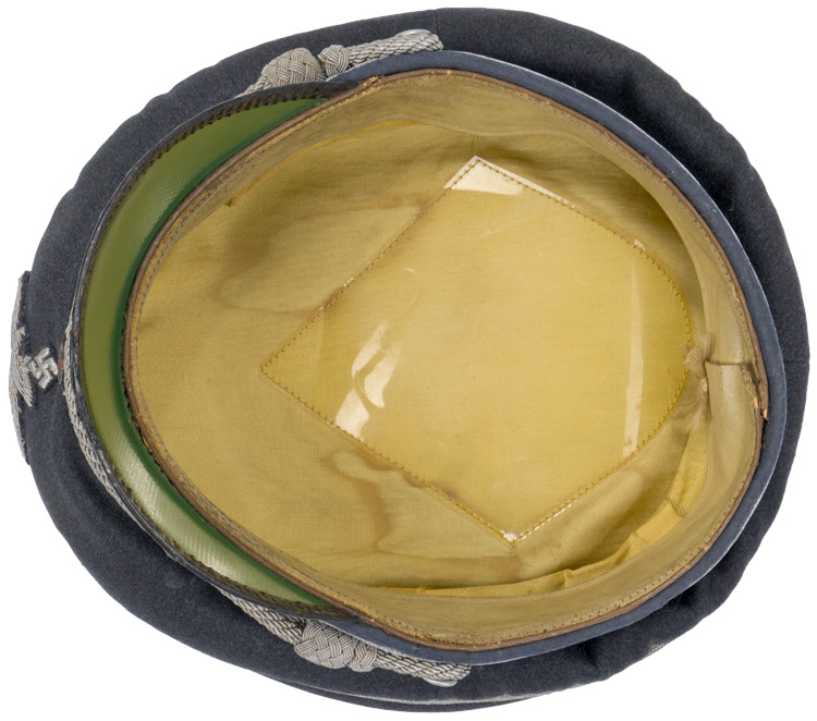 BACKGROUND: Visor caps were a standard item for all military personnel during the Third Reich period and regulations dictated the form of dress they were to be worn with, based on the individual’s rank. On its inception on February 26TH 1935, the Luftwaffe adopted most of the uniform items of the earlier DLV, Deutscher Luftsportverband, (German Air Sports Association), its clandestine, civilian forerunner, including the visor cap. In March 1935 the earlier, "Tellerform", saucer shaped, caps were replaced with a new a "Sattelform" cap with a higher front peak and an oval shaped top. The insignia utilized on the visor caps consisted of the Luftwaffe style national eagle as introduced for wear by Fliegerschaft, (Pilot Base), personnel of the DLV on August 18TH 1934 and was officially adopted for wear by all Luftwaffe personnel on March 1ST 1935 along with a new winged wreath and national tri color cockade. The visor caps for Company and Field grade Officers holding the ranks of Leutnant up to Oberst were distinguished from EM/NCO’s caps by bright, silver/aluminum piping and a silver/aluminum chin cord while Officers holding Generals ranks of Generalmajor up to Reichsmarschall utilized gold colored fittings. EM/NCO ranks visor caps utilized the appropriate waffenfarbe, (Branch of Service Color), piping and blackened leather chinstraps. Officers and certain senior NCO ranks were responsible for purchasing their own caps and as a result were allotted a clothing allowance through the Luftwaffe’s Verkaufsabteilung, (Air Force Sales Department), system. The Officers and certain senior NCO’s could choose to purchase their caps from the armed forces clothing depots or to privately purchase visor caps of higher quality. Although enlisted personnel were issued their caps from government supplies they were also permitted to purchase privately tailored caps although the price may have been restrictive. This example is a privately purchased cap with minor variations from the officially issued caps with the most noticeable deviation being the lack of the simulated leather trim applied to the forward edge of the visor. A photographic example of a similar cap can be seen in B. L. Davis’s book, Uniforms and Insignia of the Luftwaffe, Volume 1: 1933 1940 on page 207.