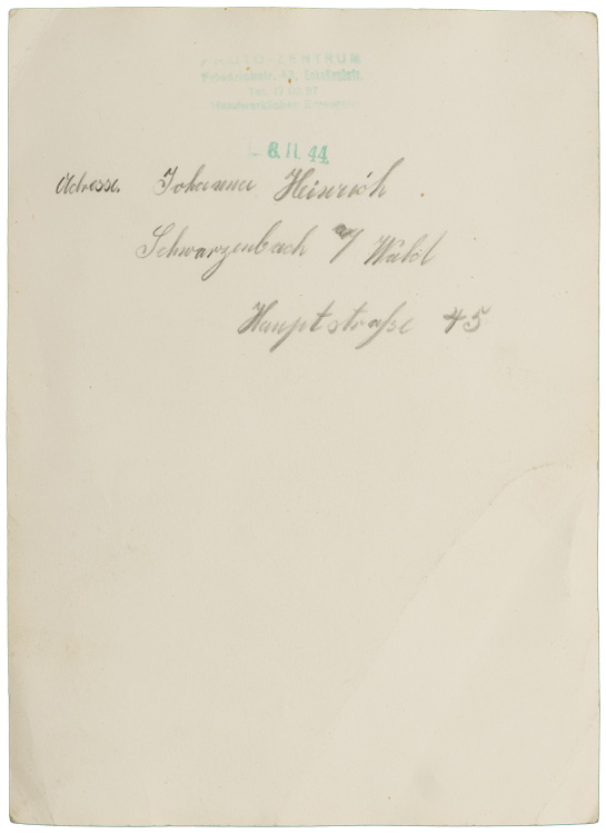 A 13cm x 18cm black and white studio portrait that has some creasing along the left facing corner. The officer’s uniform bears Obergefreiter's Collar Tabs, an Observer’s badge, a clasp, and an Iron Cross ribbon. To the reverse is handwriting that includes a 1945 date.
