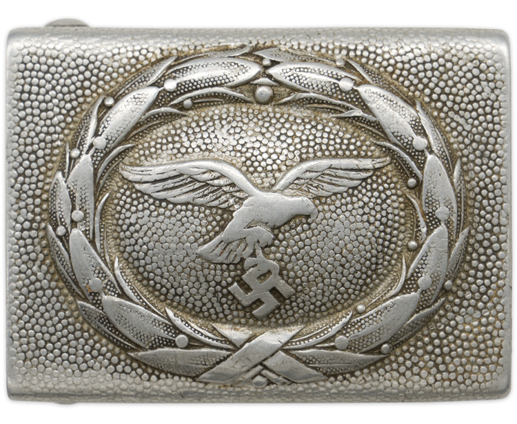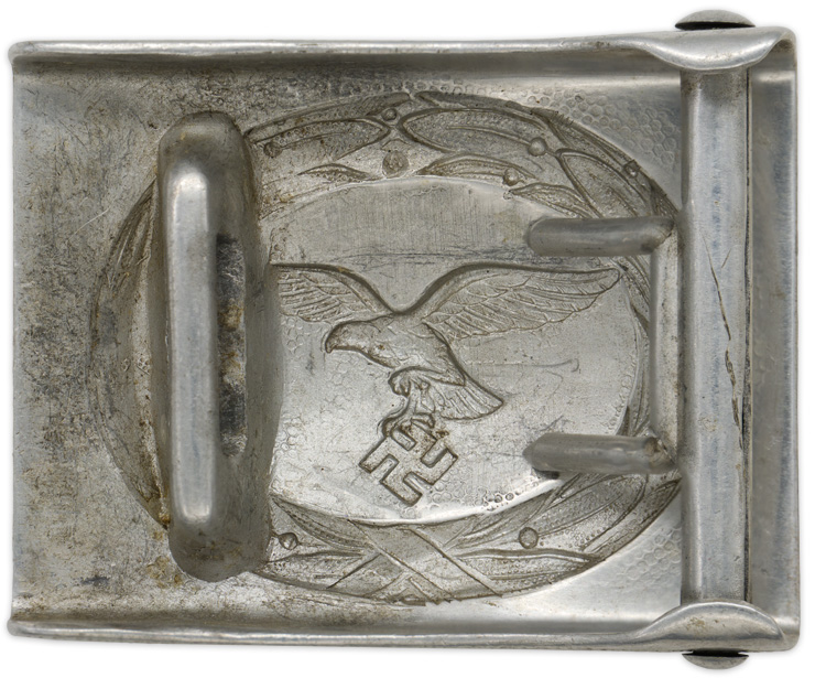 BACKGROUND: Military belts and their corresponding buckles date back centuries and were initially designed for attaching swords and daggers. In 1847 a new innovative box buckle with a quick release catch and corresponding belt were introduced which resulted in a Prussian, Hauptmann Virschow, initiating a new method of carrying personal equipment with the belt and shoulder straps supporting the majority of the weight. This system, with modifications, remains in use in most of the armies in the world to this day. During the Third Reich there was a prescribed form of wear of the belt and buckle with the buckle being positioned on the right side and the corresponding buckle catch on the left side. First introduced on May 20TH 1935, the Luftwaffe EM/NCO’s belt buckle underwent minor modifications in late 1937 or early 1938 with a new pattern eagle and again in 1940 with a slight difference in construction. Of Note: Luftwaffe personnel initially utilized brown leather accoutrements but during the war the leather items were generally blackened.