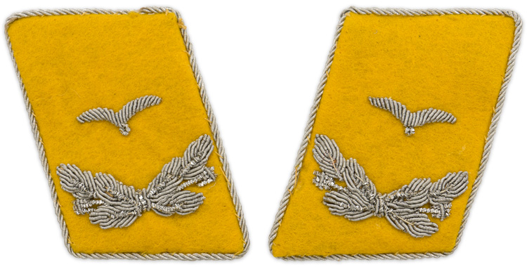 BACKGROUND: The Reichsluftwaffe was officially established on February 26TH 1935 as the third branch of service of the German Armed Forces. On March 9TH 1935 the formation of the new Reichsluftwaffe was announced to the foreign press and on March 16TH conscription was reintroduced for all three branches of service. On May 21ST 1935 the Reichsluftwaffe designation was altered to Luftwaffe. Collar tabs were adopted by the newly formed Luftwaffe on April 14TH 1935 and followed the basic pattern of the collar tabs that had been utilized by its earlier civilian forerunner the, DLV, Deutscher Luftsport Verband, (German Air Sports League). The collar tabs were worn in matching pairs and indicated the branch of service and rank of the wearer. The different branches of service within the Luftwaffe were allocated a specific identifying waffenfarbe, (Branch of Service Color), with golden yellow being chosen for personnel serving with Flieger, (Flight), units, which was generally displayed as the base color of the collar tabs.